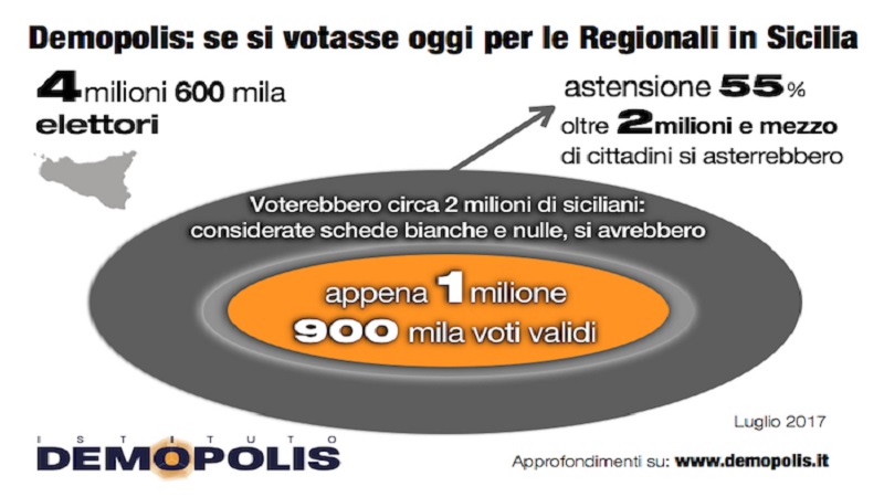 Se si votasse oggi per le Elezioni Regionali in Sicilia, oltre 2 milioni e mezzo di cittadini resterebbero a casa. Su 4 milioni e 600 mila elettori, si recherebbero alle urne circa 2 milioni di siciliani, molto meno della metà degli aventi diritto. È quanto emerge da un’analisi condotta dall’Istituto Demopolis a 4 mesi dal voto del 5 Novembre per l’elezione del nuovo Presidente della Regione ed il rinnovo dell’ARS.